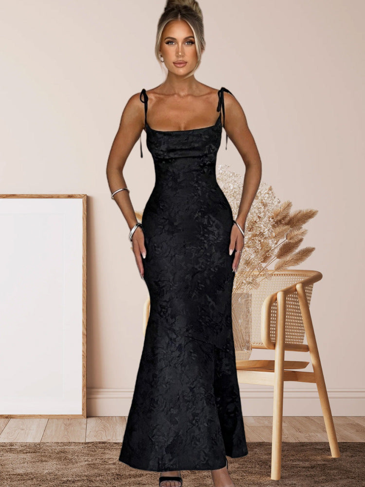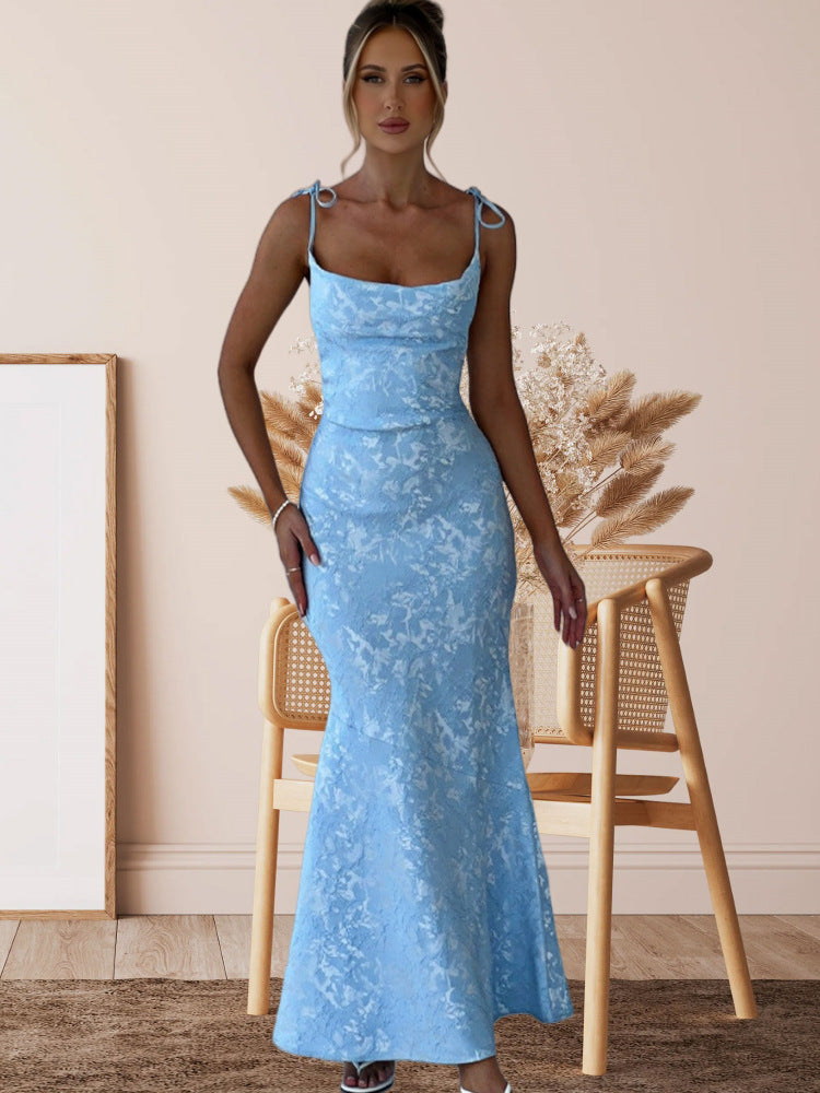 Élise Royale adds glamour to any evening with its long-length design, thin straps, and figure-hugging fit. Its intricate lace-look fabric, combined with sheer details, creates a feminine yet elegant effect.